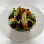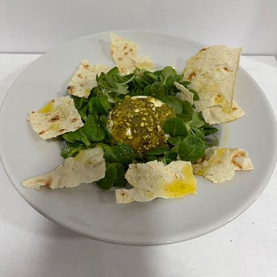 Mozzarella “fior di latte de Agerola”, rocket salad, cherry tomatoes, parmesan flakes, pesto mousse and 125g burrata dressed with soy oil