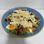 Lechuga romana, picatostes, pollo a la parrilla, tomates datterini rojos, aceitunas negras, lascas de Grana Padano, salsa César