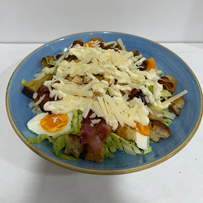 Lattuga romana, crostini di pane, pollo grigliato, datterini rossi, olive nere,scaglie di grana padano, salsa Caesar