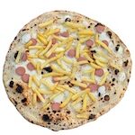 Tomate, champiñones, alcachofa, olivas negras, jamón york, mozzarella “fior di latte de Agerola”, albahaca , pecorino romano rallado y aceite de semilla