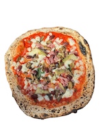 Tomato sauce, mushrooms, artichokes, black olives, cooked ham,m ozzarella “fior di latte de Agerola”, basil , grated Pecorino Romano and soy oil