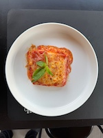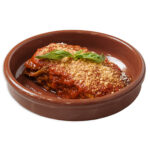 Breaded and fried aubergine, mozzarella, tomato, cheese, black pepper and basil