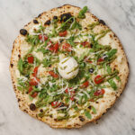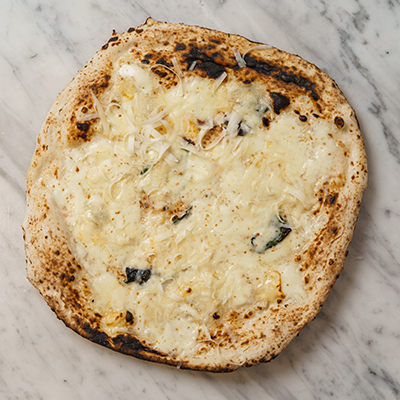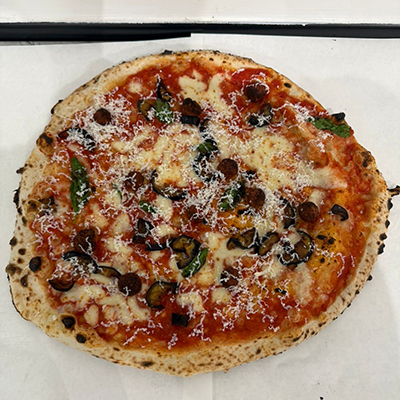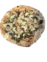 Sausage, mozzarella “fior di latte de Agerola”, provola, friarelli, basil, grated Pecorino Romano and soy oil.