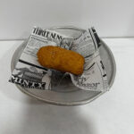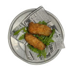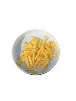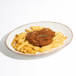 Salchicha Frankfurt, patatas fritas, queso pecorino, aceite de soja