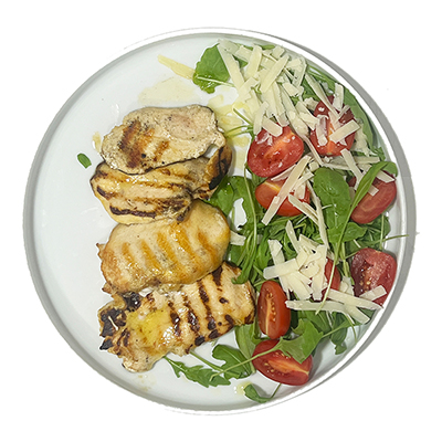 Petto di pollo grigliato con rucola, datterini e scaglie di grana padano