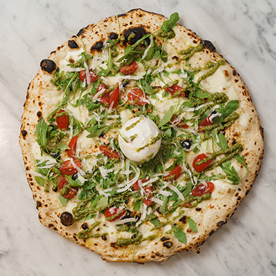 Fior di latte , rucola, pomodorini , scaglie di parmigiano, mousse di pesto e burrata da 125gr condita con olio di semi di soia
