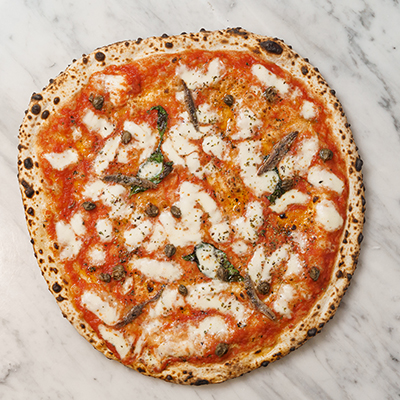 Tomato, “fior di latte Agerola” mozzarella, anchovies, capers, oregano and soy oil