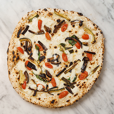 Mozzarella ''fior di latte di Agerola'', albergínia, carbassó, tomàquets cherry, formatge provola, pecorino romano i oli de llavors