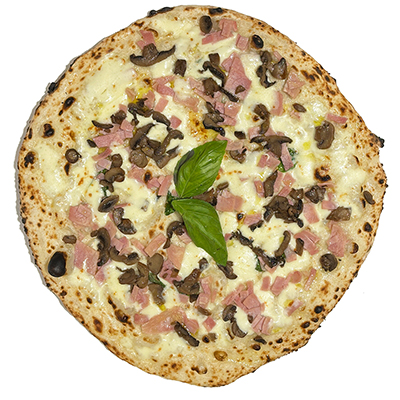 Mozzarella “fior di latte de Agerola”, basil, pecorino Romano, mushrooms, baked ham and soy oil