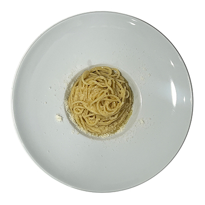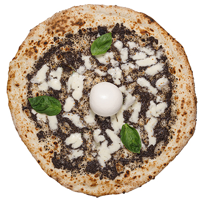 Gorgonzola, emmental, mozzarella “fior di latte de Agerola”, basilico, pecorino Romano grattugiato e olio di semi soia