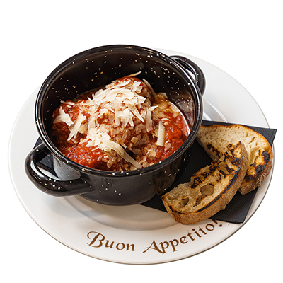 Polpette with tomato sauce with parmesan flakes and toasted bread