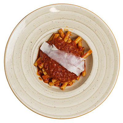 Clàssica “lardiata” napolitana, tomàquet San Marzano, cansalada de Colonnata, alfàbrega, oli d’oliva verge extra, formatge pecorí