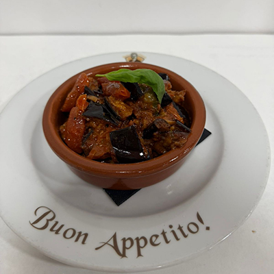 Pomodoro, provola, pecorino, olio di semi di soia, basilico, polpettine fritte, melanzane fritte