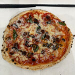 Pizza con ricotta, cicoli, salame, mozzarella ''fior di latte di Agerola'', basilico, salsa di pomodoro e olio di semi di soia